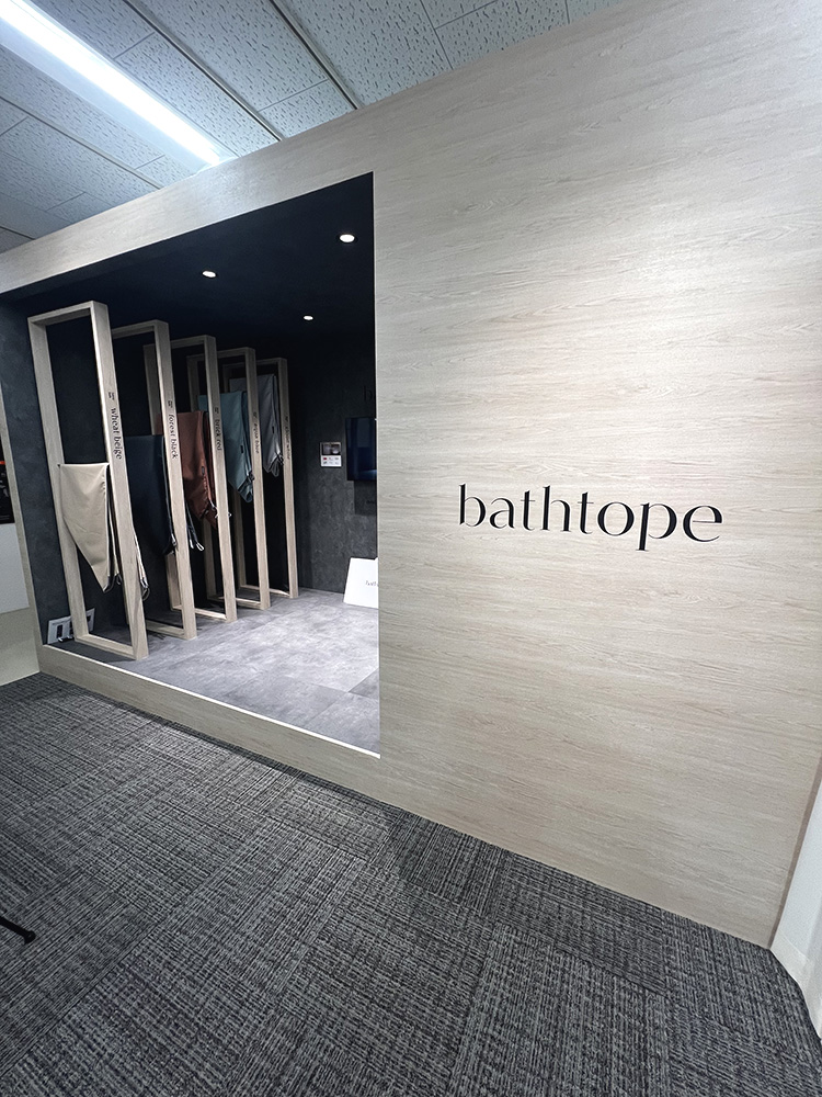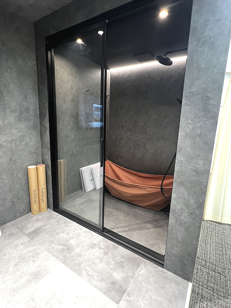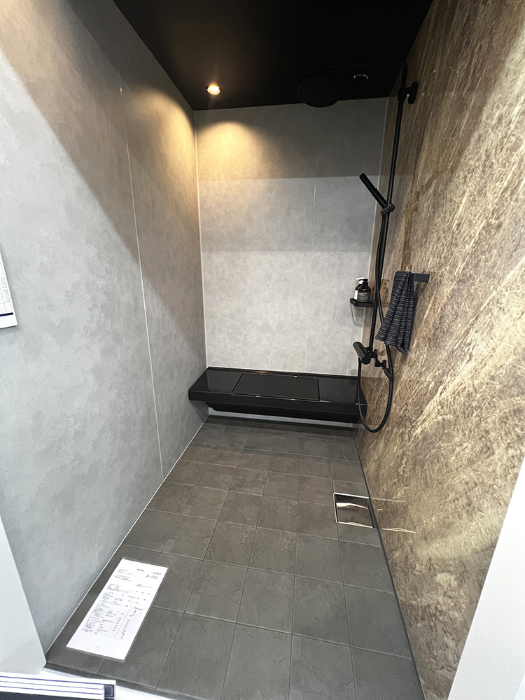 布と対面する壁にフックが付いており、強度的に大丈夫かというお話があがりましたが、大丈夫のようです。フックがかかる箇所にはしっかりと補強をいれるみたいです。ほぼ毎日お風呂に入る中で、シャワーしかつかわないよ、という方はこういう商品はいいかもしれないですね。そもそもバスタープの商品でなくても、隣に1坪サイズのユニットバスが置いてありました。こちらは浴槽無のベンチシートのみでした。ということは浴槽に入浴する方が少なくなってきているんだなと感じました。